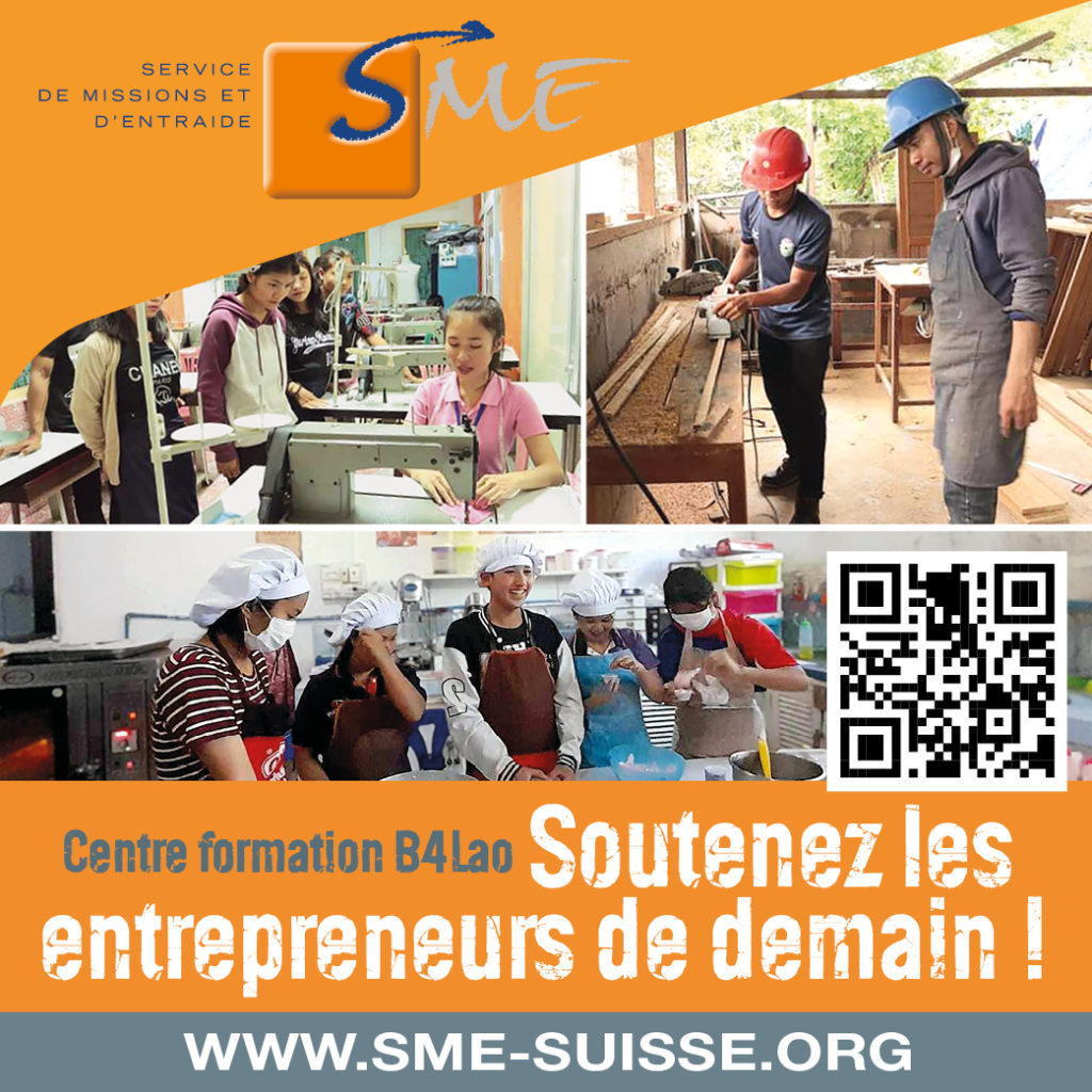Pour cette année, le SME a choisi de focaliser son appel aux dons sur le Centre B4Lao au Laos. Ce centre dispense des formations professionnelles en boulangerie, menuiserie, couture et soins esthétiques pour une quarantaine d’étudiants issus de minorités ethniques. L’approche englobe des stages en entreprise et l’accès au micro-crédit, pour le lancement d’activités génératrices de revenus (AGR). L’objectif est de soutenir une dizaine d’étudiants par an dans leur projet entrepreneurial. Cible : CHF 7’500.- D’avance merci !